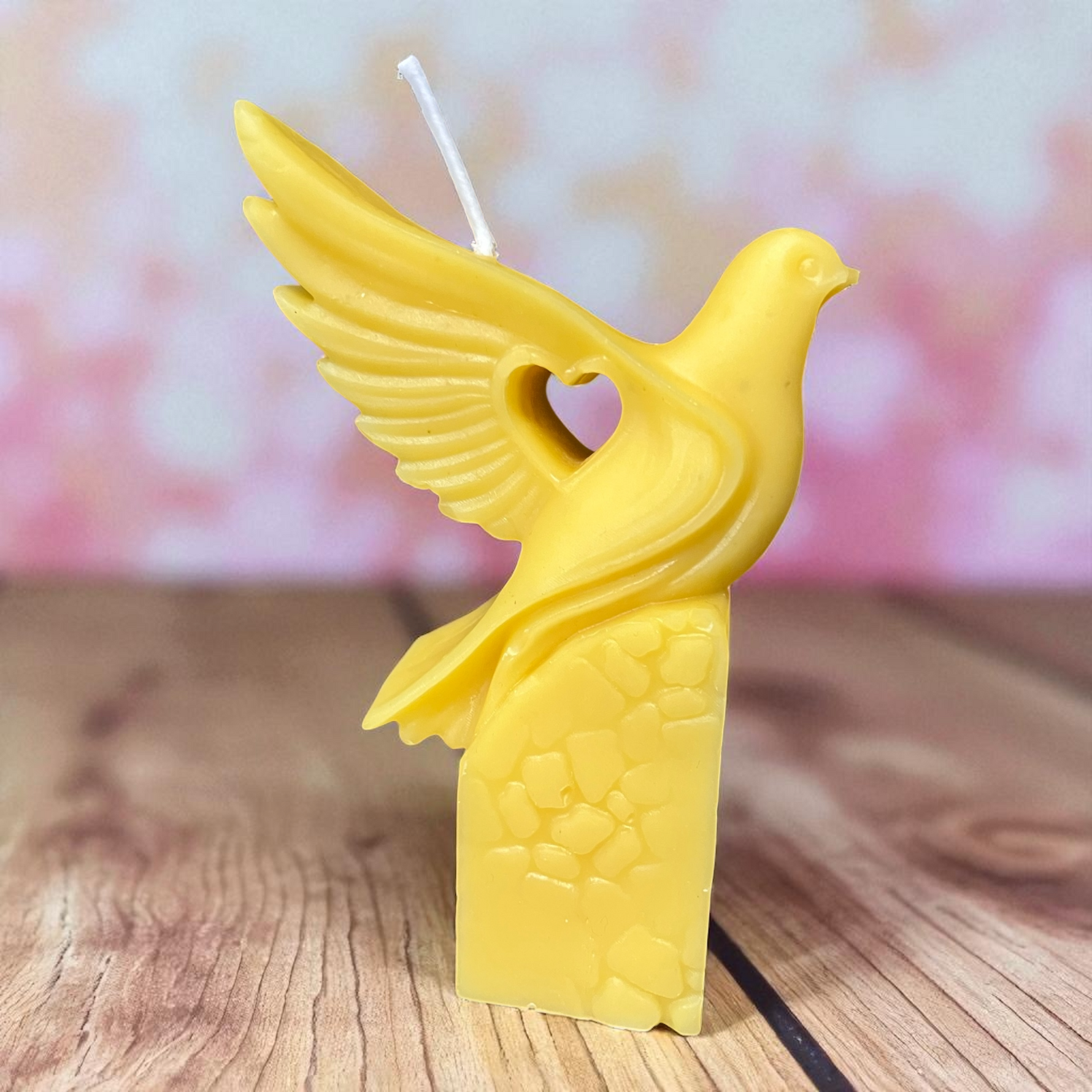 Son design raffiné représente une colombe majestueuse aux ailes déployées, posée sur un socle texturé rappelant les alvéoles d’une ruche — symbole d’harmonie entre nature et spiritualité.