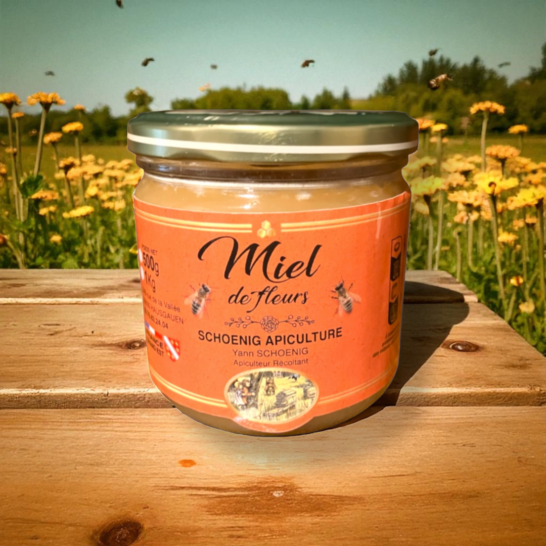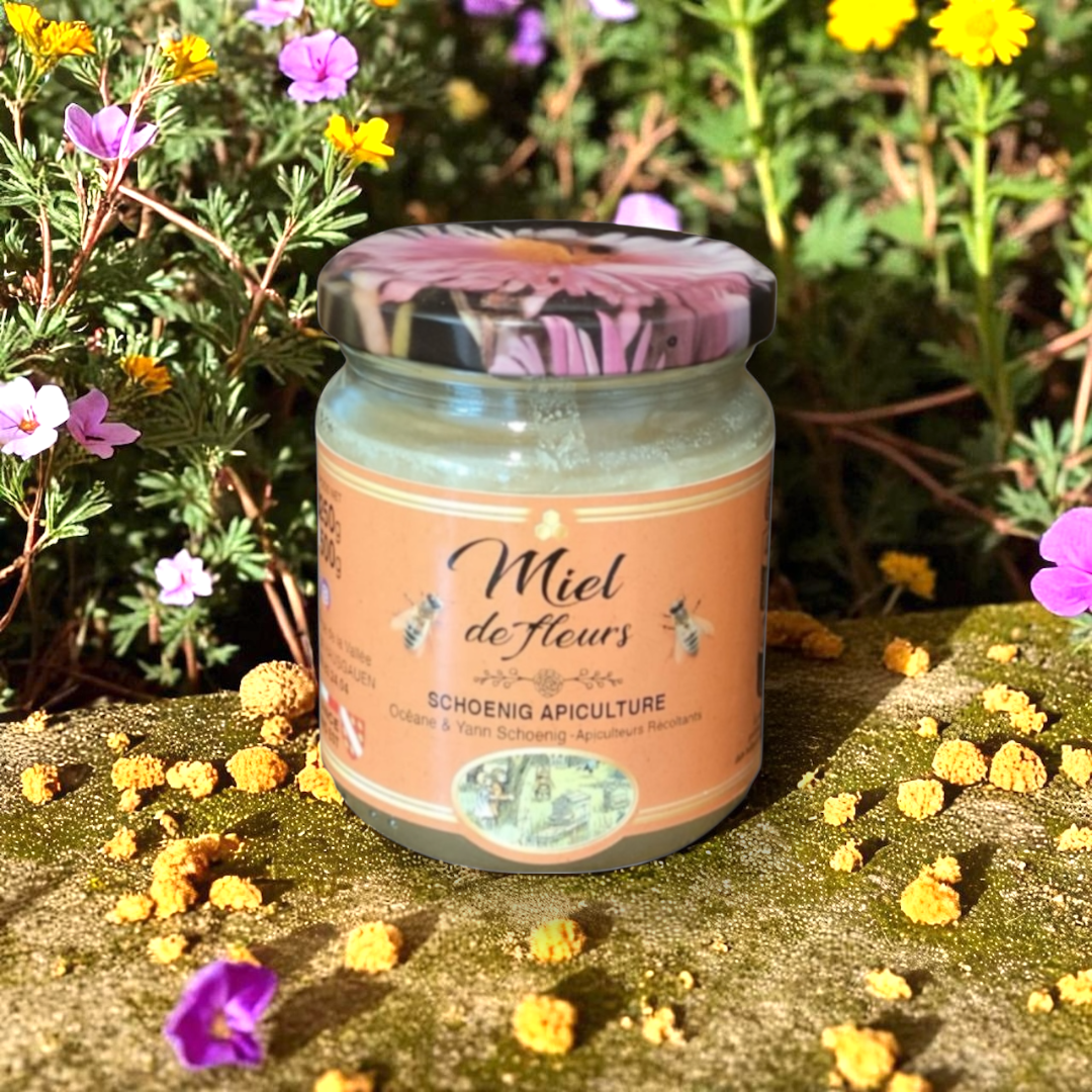 Récolté avec passion par Schoenig Apiculture, dans le Haut-Rhin au cœur de l’Alsace, notre miel de fleurs crémeux séduit par sa texture onctueuse et sa saveur florale équilibrée, à la fois douce et parfumée.
