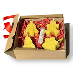 Elle renferme quatre bougies artisanales en cire d’abeille, aux formes festives et chaleureuses, accompagnées d’un baume à lèvres à choisir selon vos envies.