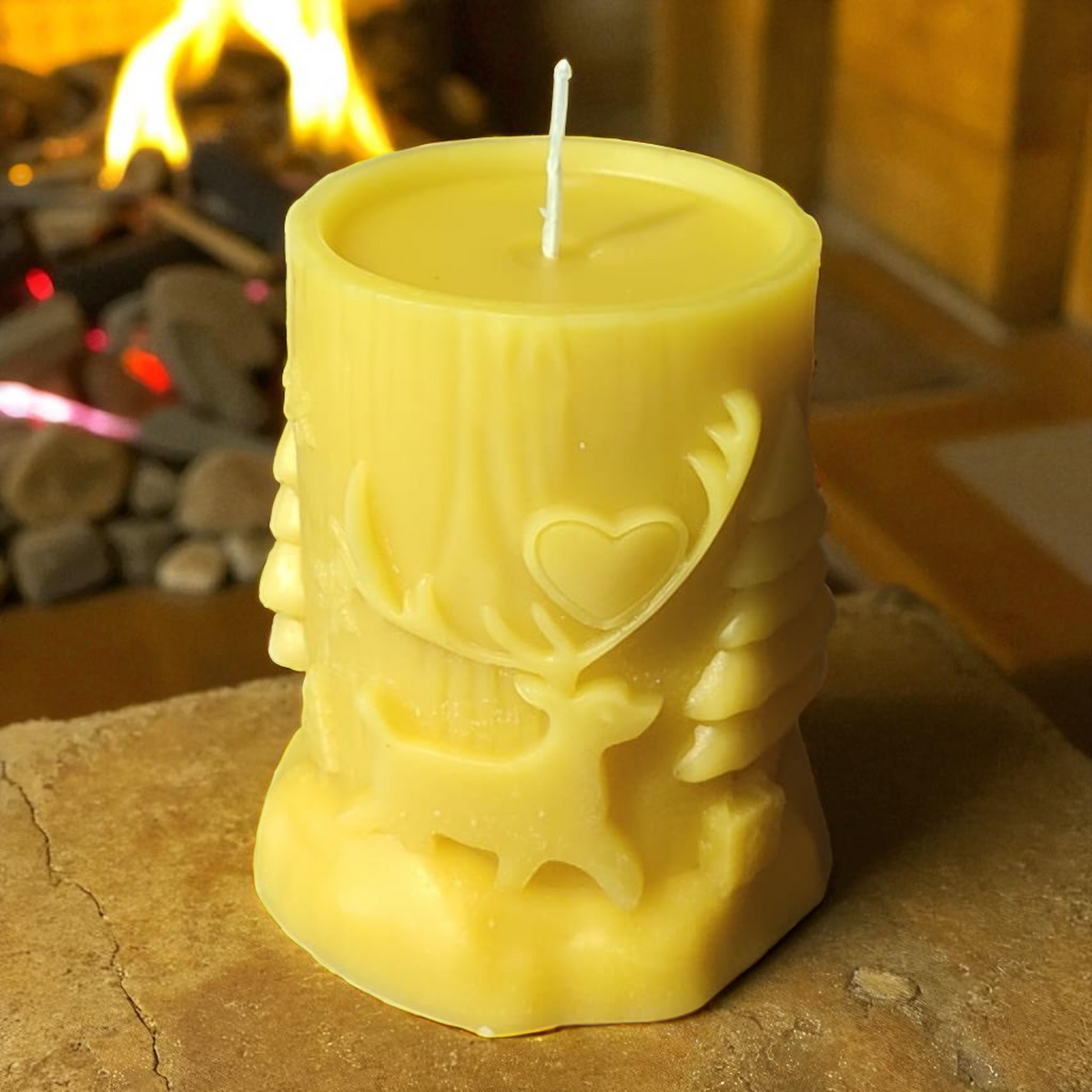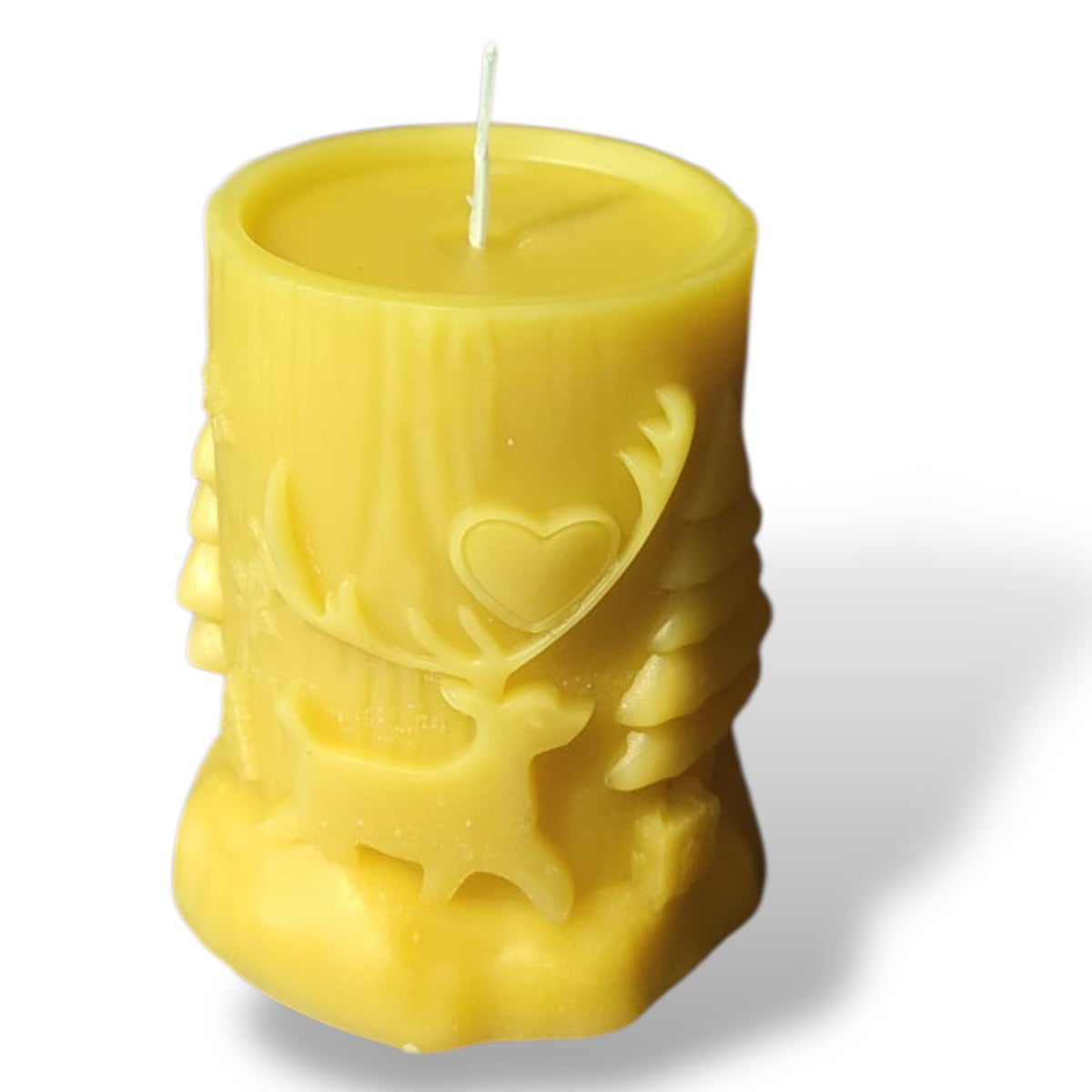 Coulée à la main dans notre atelier du Sundgau, cette bougie en cire d’abeille 100 % naturelle présente un relief tout en finesse : un renne paisible, un cœur sculpté et des sapins stylisés se détachent d’un fond rappelant un tronc d’arbre.